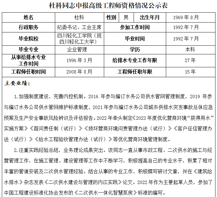 根據(jù)《四川省建設工程技術人員職稱申報評審基本條件》(川建行規(guī)〔2023〕3號)的規(guī)定,經(jīng)審查,杜科同志符合申報條件。為體現(xiàn)公開、公平、公正原則,接受社會公眾監(jiān)督,現(xiàn)將其個人基本情況等材料予以公示,公示期為2023年10月7日至10月11日。如有不同意見,請于公示期內,以書面形式向公司人力資源部反映。