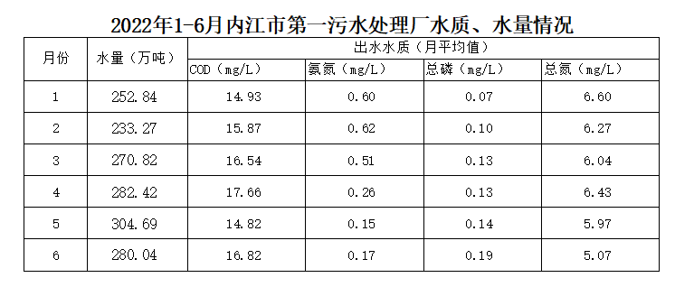 內江市污水處理有限責任公司第一污水處理廠2022年1-6月水量、水質情況
