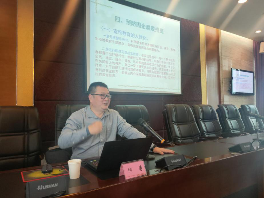 講座上,何勇以“國(guó)有企業(yè)預(yù)防腐敗實(shí)踐探索”為題,從建國(guó)以來反腐敗歷史的簡(jiǎn)要回顧、當(dāng)前國(guó)企領(lǐng)域反腐敗的形勢(shì)、水務(wù)企業(yè)違紀(jì)違法典型案例、預(yù)防國(guó)企腐敗措施四個(gè)方面,剖析腐敗根源,深入淺出地將國(guó)有企業(yè)預(yù)腐防變工作做了詳細(xì)的梳理和講解,具有很強(qiáng)的教育性和警示性。公司黨委副書記、總經(jīng)理李濤結(jié)合講座內(nèi)容,對(duì)進(jìn)一步抓好黨風(fēng)廉政工作提了四點(diǎn)要求:一是要強(qiáng)化政治定力;二是要抓實(shí)紀(jì)法學(xué)習(xí);三是要堅(jiān)持嚴(yán)于律己;四是要自覺接受監(jiān)督。李濤強(qiáng)調(diào),講座的目的在于進(jìn)一步提高干部職工對(duì)黨風(fēng)廉政建設(shè)重要性的認(rèn)識(shí),切實(shí)加強(qiáng)廉潔自律教育,將黨風(fēng)廉政建設(shè)不斷引向深入。