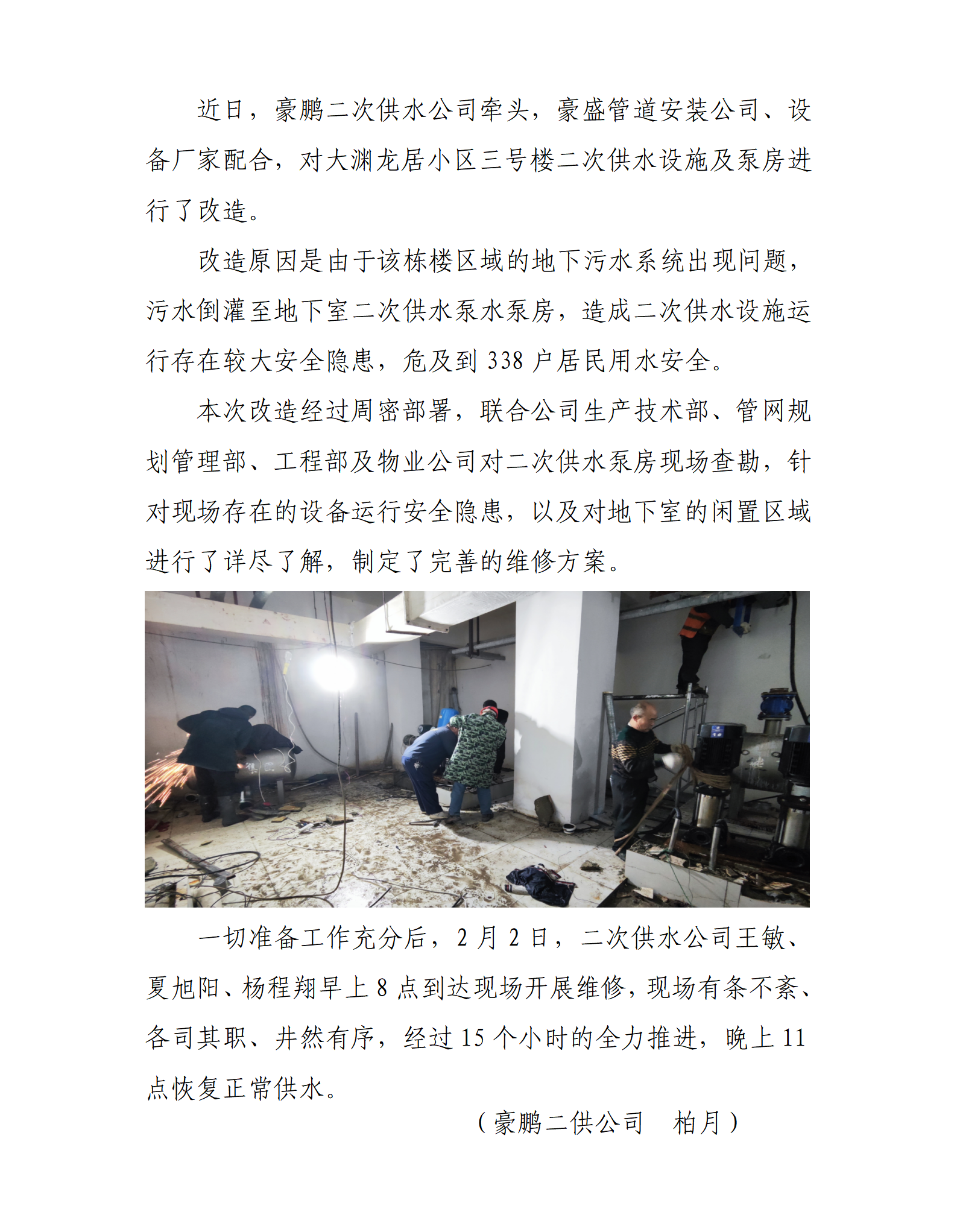 豪鵬公司牽頭對大淵龍居小區二次供水設施及泵房進行改造